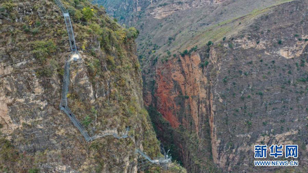 通往四川省涼山彝族自治州昭覺縣支爾莫鄉阿土列爾村的鋼梯一角(2019年11月23日攝,無人機照片)?!皯已麓濉笔前⑼亮袪柎宓膭e稱,從山底到山上村莊海拔落差約800米。2020年5月,阿土列爾村84戶建檔立卡貧困戶344人,陸續搬遷至位于昭覺縣易地扶貧搬遷縣城集中安置點的新家。新華社記者 王曦 攝