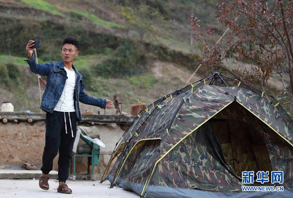 2019年11月23日,在四川省涼山彝族自治州昭覺縣支爾莫鄉阿土列爾村,某色拉博用手機拍攝哥哥某色拉洛家租給游客的露營帳篷,準備發到網絡直播平臺上。新華社記者 江宏景 攝