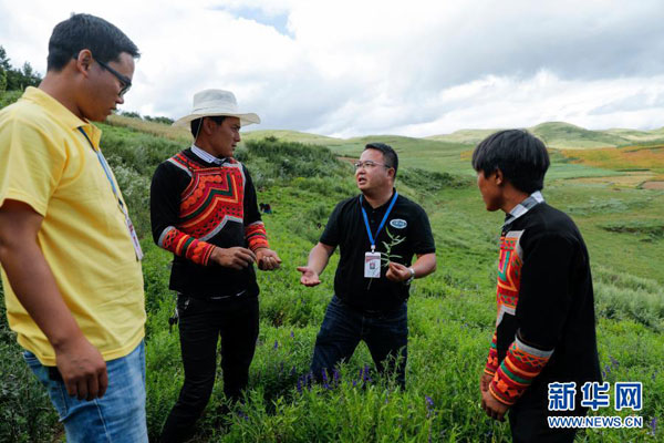2020年8月14日,在位于四川省涼山彝族自治州昭覺縣龍溝鄉境內的海拔2850米的波火爾且高山坡地上的黃芩種植基地,西南醫科大學副教授夏紀毅(右二)和該校派出的駐村工作隊員俄且莫機(左一)為當地彝族群眾講授黃芩種植和采摘技術。新華社記者 沈伯韓 攝