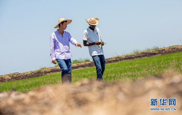 2019年11月28日,在莫桑比克萬寶莫桑農業園,中國農業專家(左)和當地農業技術人員巡查水稻田。新華社記者 張宇 攝