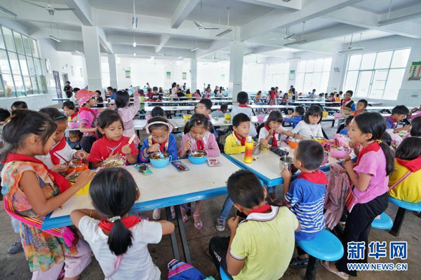 2019年6月11日,云南西雙版納基諾山基諾族鄉民族小學的學生在吃營養午餐。新華社記者 秦晴 攝