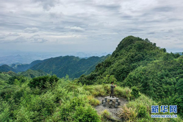 2020年7月9日,在廣西大瑤山國家級自然保護區長灘河保護站龍道山護林點工作站,瑤族護林員黃通甫在調試衛星電話,今年48歲的黃通甫已在這個崗位上堅守了14年(無人機照片)。新華社記者 曹祎銘 攝