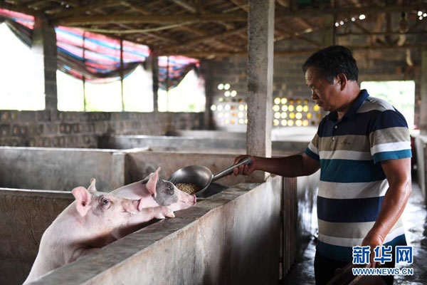 廣西玉林市興業縣石南鎮六聯村村民楊海在自家的豬舍內給豬喂食(2019年8月17日攝)。新華社記者 曹祎銘 攝