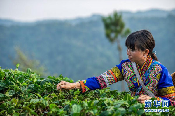 2020年4月11日,在云南省勐??h布朗山鄉,拉祜族婦女娜四在采茶。原本連育秧苗、撒化肥都不會的娜四,在扶貧干部指導下,全家經過幾年發展已種下18畝茶樹。新華社記者 胡超 攝