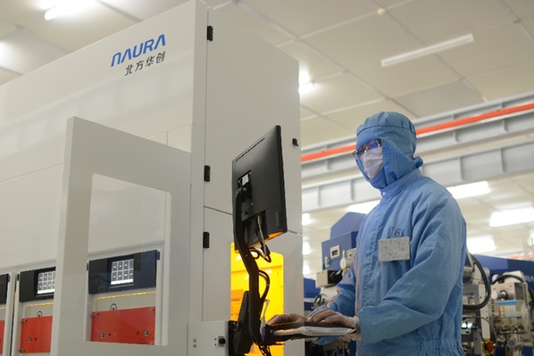 在位于北京經濟技術開發區的北方華創二期生產基地,兩萬多平方米的研發凈化車間內,身著凈化服的技術人員,正聚精會神調試著一臺臺大型集成電路裝備。