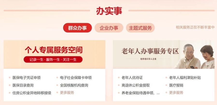 目前,“我為群眾辦實事,一網通辦解民憂”專欄根據不同的服務對象和主題提供多項政務服務。專欄的“辦實事”板塊涵蓋“群眾辦事”“企業辦事”和“主題式服務”三個方面,提供“個人專屬服務空間”“老年人辦事服務專區”“企業專屬服務空間”“‘跨省通辦’服務專區”等多個集成式政務服務,還將根據群眾意見不斷豐富為企業和群眾辦實事的服務事項。