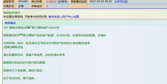 交易編號為41847的帖子顯示,其擁有前述商業銀行理財客戶數據48800條?!霸摂祿閮裙韼С?,首次在暗網發布,每份售價168美元?!卑l帖者稱。
