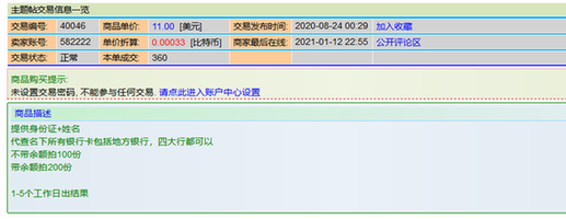 除了黑客等技術人員盜取批量信息之外,也有一些“內鬼”直接參與其中。交易編號為40046的帖子顯示:“只要提供身份證和姓名信息,便可代查名下所有銀行卡具體信息,不帶余額1100美元,結果帶余額需2200美元,1-5個工作日即可出結果?!敝档米⒁獾氖?,該貼自2020年8月24日發布以來,目前已交易多達360單。