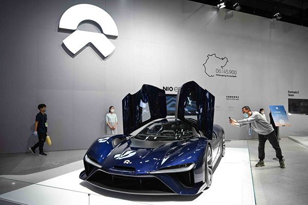 蔚來的跑車吸引觀眾停下腳步拍照。記者 潘越 攝
