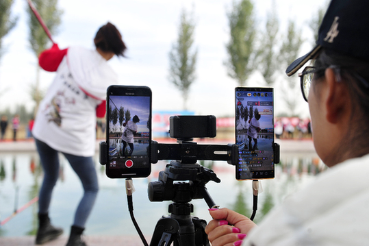 在肅寧縣舉行的一場釣魚比賽中,主播利用直播平臺現場直播,向網友推介肅寧魚竿。新華社發(苑立偉 攝)