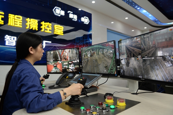 工作人員在華菱湘鋼五米寬厚板廠智慧天車遠程操控室內作業。(資料照片)新華社記者 陳振海
