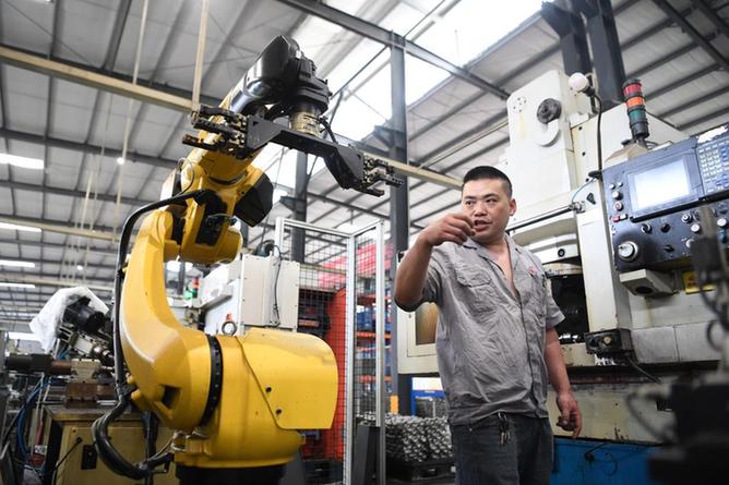 6月17日,重慶綦江的一個生產車間內,技術人員在調試自動化機器手。新華社記者 唐奕 攝