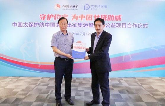 7月12日,中國太保向國家體育總局排球運動管理中心遞送中國女排專屬定制保單。(中國太保供圖)