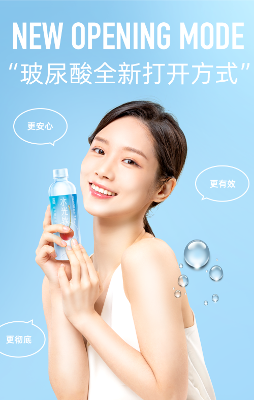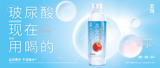 此次宜簡推出的水光飲玻尿酸飲品,每瓶含玻尿酸成分68mg。相較市面上含有玻尿酸成分的產品,一片玻尿酸面膜的含量約為5-15mg,一支玻尿酸針劑的含量約20mg,宜簡水光飲一瓶68mg的添加量無疑是具備市場競爭力的。據悉,該核心成分源自玻尿酸龍頭企業--華熙生物的專利原料。據華熙生物研究,玻尿酸具有良好的保濕性和增強皮膚組織彈性功能,1g玻尿酸可結合1kg水分,持續性的補充可以清除體內自由基從而延緩組織衰老。簡而言之,就是增加皮膚水分、抗氧化和抗衰老。