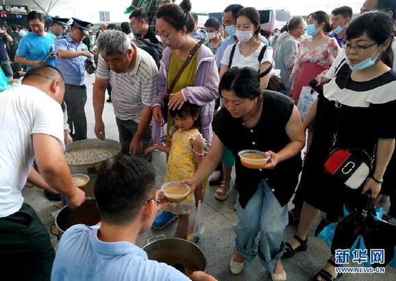 7月21日,滯留旅客在鄭州東站進站口處排隊領取早餐。