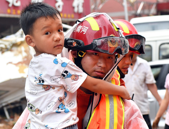 7月21日,在鞏義市米河鎮,消防救援人員幫助群眾轉移。