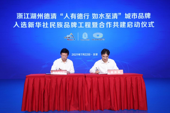 7月22日,浙江湖州德清城市品牌入選新華社民族品牌工程簽約儀式在京舉行,現場首次發布“人有德行 如水至清”德清城市品牌主推廣語和視覺識別系統。