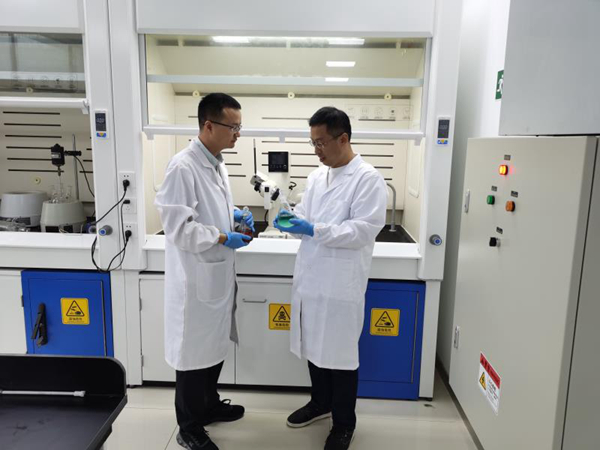 博創宏遠新材料有限公司負責人趙杰博士(右)正在做鋰電正極材料研發實驗。(資料照片)