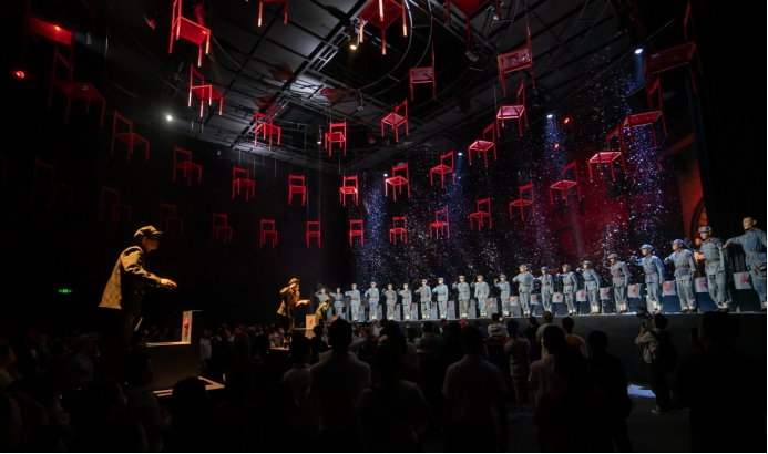 設計之初,這部劇就盡量打破常規。觀演方式上,觀眾擺脫常規的舞臺鏡框模式,跟隨情節依次進入每個表演區,“邊走、邊看、邊感受”,完全是沉浸式的體驗。其次,這是國內首部紅色故事為背景的情景劇,以一本老紅軍日記為線索,展現一個曲折的故事,表達對革命英雄的謳歌與緬懷。在舞臺創新上,該劇首創巨型開合升降裝置,讓觀眾凝視觸摸碩大的紅旗,極大調動了觀眾情緒,增加互動體驗,這種表達方式在全國舞臺藝術上也有開創意義。