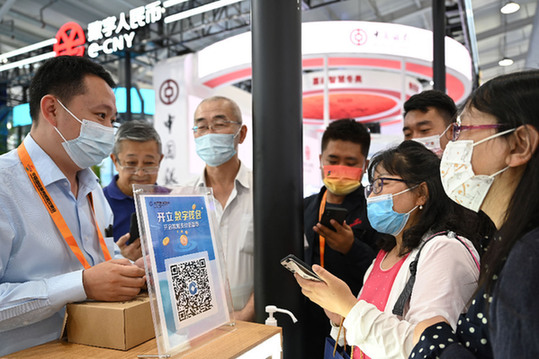 在2021年中國國際服務貿易交易會金融服務專題展區,觀眾在咨詢數字人民幣支付業務。