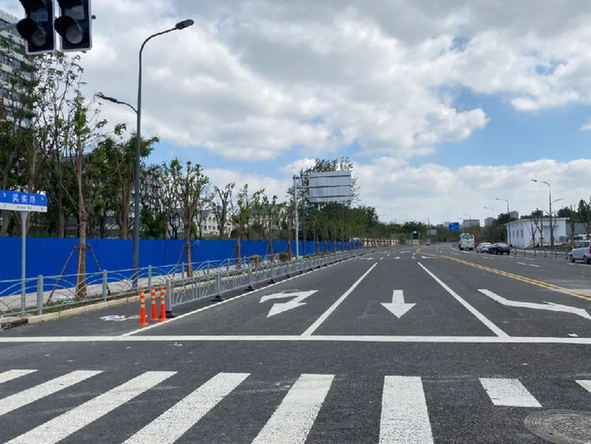 由于目前還未通車,記者從吳美路合川路走到了吳美路虹許路,分為三段,分別是合川路-萬源路、萬源路-蓮花路、蓮花路-虹許路,只見嶄新的瀝青路面上,各種交通標線已經劃好,路燈和交通標識牌均已安裝完成;道路兩旁,兩排整齊的綠化樹苗長勢良好。在道路連接萬源路、蓮花路部分,仍用圍擋圍住。記者走完全程,大概花了半小時,路況很好,非常便捷。