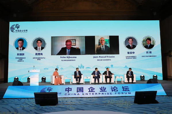 9月23日,中國建材集團黨委書記、董事長周育先在第四屆中國企業論壇中外企業家對話會現場。