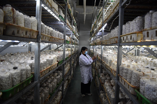 河南世紀香食用菌開發有限公司員工正在查看白靈菇菌種生長情況。新華社記者 李嘉南 攝