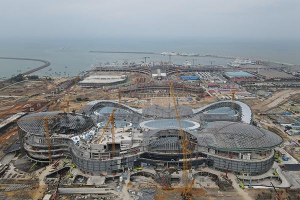 目前,??趪H免稅城免稅商業中心正在進行屋面網架、外立面幕墻及室內精裝等作業。??趪H免稅城項目建成后,將成為??谛碌貥?、國際旅游消費中心的新名片。