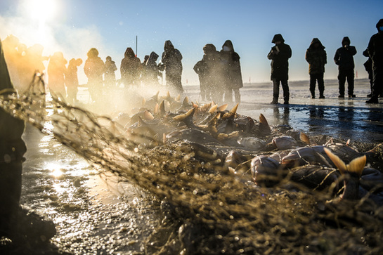 晨曦微露,白茫茫的查干湖面鋪上一層暖色,漁民們齊聲喊著號子,用“冰镩子”打出冰窟,將長桿沿著冰窟把漁網送進水里。七八個小時后,清脆的揚鞭聲中,八匹馬喘著粗氣拉動絞盤,漁網一寸寸從冰窟里浮出水面,數萬斤魚在氤氳的水氣中連蹦帶跳地被拉上冰面。游客沸騰了,拍照、選魚、直播……兩個小朋友抬起一條30斤的胖頭魚,快樂歡呼。
