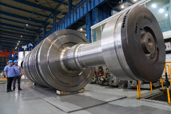 2021年7月1日,中國一重集團有限公司軋電制造廠生產車間,工人在對企業自主制造的百萬千瓦整鍛低壓轉子進行檢測作業。新華社記者 王建威 攝