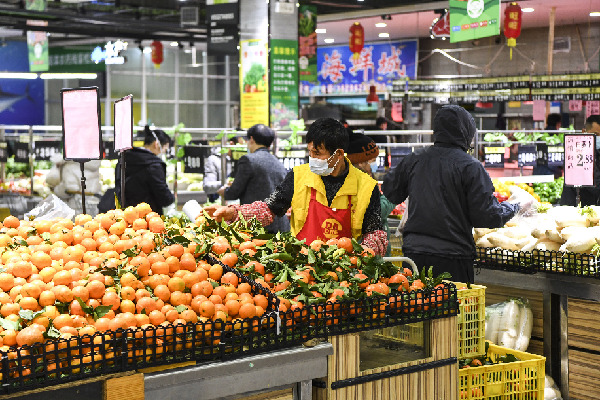 2月9日,工作人員在廣西德??h一家超市內補充投放新鮮水果。