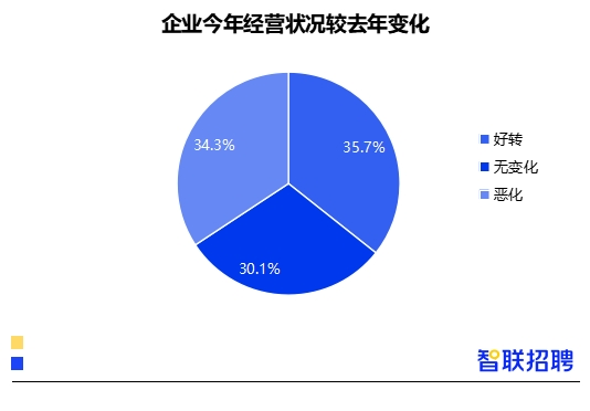 智聯招聘春節后面向企業的調研數據顯示,35.7%的企業表示今年春季經營狀況比去年好轉,34.3%表示惡化,30.1%認為無變化。各占3成,判斷截至目前,今年春季企業總體經營狀況較為平穩。