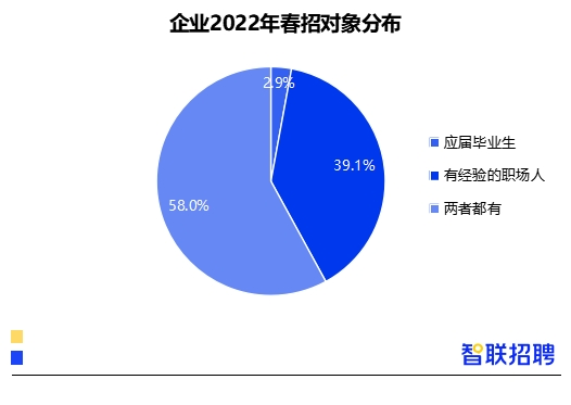 從企業春招對象來看,調研顯示,58%的受訪企業同時招聘有工作經驗的職場人和應屆高校畢業生,39.1%僅針對有經驗的職場人,2.9%僅招聘應屆畢業生。此外,近九成的企業在春季校招時,同時面向2021屆和2022屆高校畢業生。