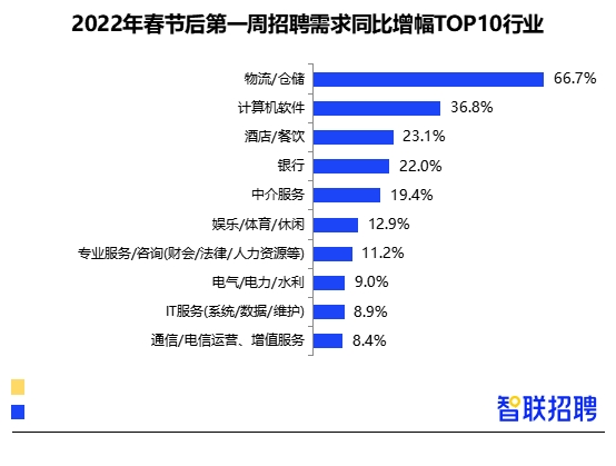 開工第一周招聘需求同比增幅前十行業中,物流/倉儲行業崗位需求旺盛,職位數增幅排名第一。疫情后,物流倉儲行業招工需求持續上漲,今年春季依然保持這一趨勢。計算機軟件、酒店/餐飲、銀行等行業招聘職位數同比增幅也相對較大。
