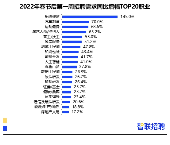 此外,配送理貨崗位增幅達145%,視頻主播、直播帶貨崗位需求旺盛,帶動演藝人員/經紀人職位數增長63.2%,汽車制造、技工、計算機技術類人才需求也均上漲。