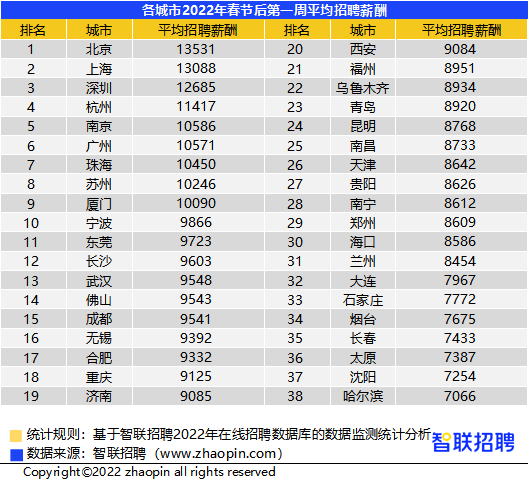 數據顯示,職場人對2022年經濟形勢抱有樂觀期待。節后首周求職行為活躍,平均招聘薪酬10088元/月,其中北上深杭居前四。金融、IT互聯網依然是高薪行業,人工智能崗位薪資21985元/月,新能源汽車、半導體、生物醫藥新晉高薪職業榜單。