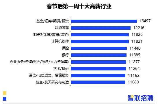 分行業來看,春節后首周基金/證券/期貨/投資行業的平均招聘薪酬高達13497元/月,仍位居行業之首,網絡游戲行業排名第二,IT服務(系統/數據/維護)和計算機軟件行業分列第三和第四,薪酬水平為11826元/月和11821元/月。月薪過萬行業數量較去年有明顯增加,保險、銀行、專業服務咨詢、通信電信、航空航天等行業也躋身“萬元俱樂部”。