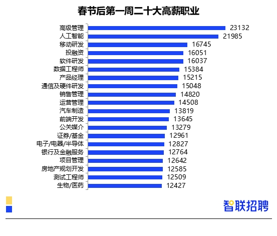 高薪職業中,企業高層管理人員薪酬為23132元/月,處于榜首。人工智能領域人才缺口大,企業紛紛通過高薪搶人引才,春節后第一周平均招聘薪酬為21985元/月,也進入月薪過2萬元的職業行列,較去年同期(18821元/月)有明顯上升。高薪職業中技術類人才居多,如移動研發、數據工程師、通信及硬件研發、前端開發等,金融類人才的薪酬水平也較為可觀,如投融資、基金證券、銀行和金融服務等職業薪酬水平也較高。