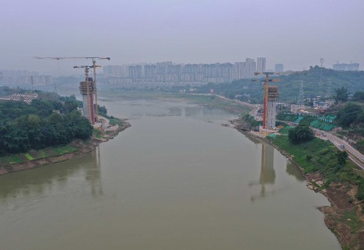 圖為2021年10月27日拍攝的四川瀘州沱江特大橋施工現場,瀘州沱江特大橋是渝昆高鐵重點控制性工程。新華社記者 劉坤 攝