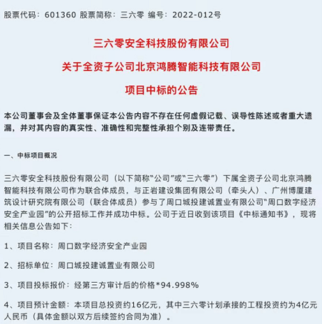 2月16日,三六零旗下的360政企安全集團與河南省周口市人民政府達成戰略合作,成功中標4億元周口數字城市安全大腦項目。雙方將共同打造周口數字城市安全大腦,集中建設網絡安全基礎設施賦能多個數字化應用場景,為周口市建設中原崛起新高地增添新動能。