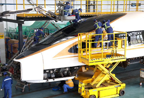 2月28日,技術人員對高鐵列車的車頭單元進行檢修。