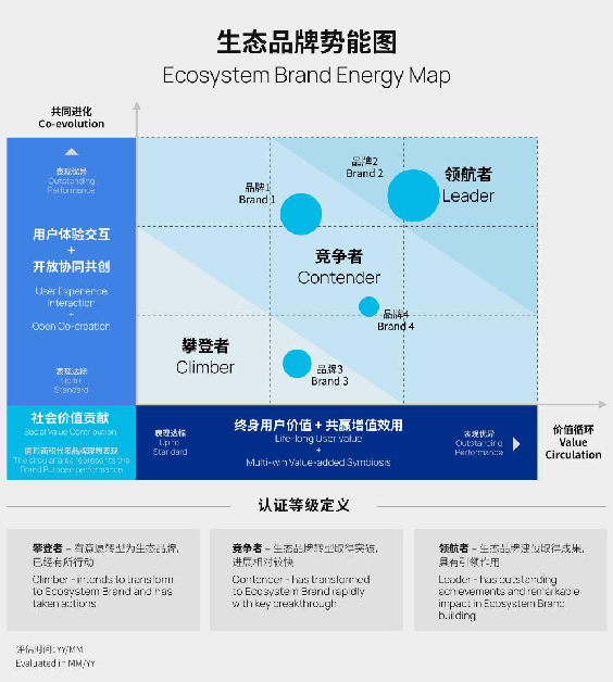 2021年,凱度、牛津大學賽德商學院、《哈佛商業評論》中文版一起合作,共同制定并全球首發「生態品牌認證體系」,從「共同進化」、「價值循環」和「品牌理想」三大視角及其下屬的五個核心維度(用戶體驗交互、開放協同共創、終身用戶價值、共贏增值效用、社會價值貢獻)和16項評估細則出發,評估品牌在生態品牌轉型與打造過程中的成效和進化階段。