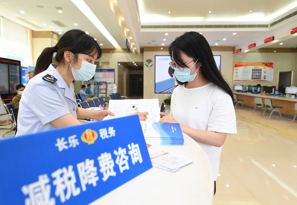 2020年8月19日,在國家稅務總局福州市長樂區稅務局辦稅大廳,工作人員在輔導企業人員辦理減稅降費業務。新華社記者 宋為偉 攝