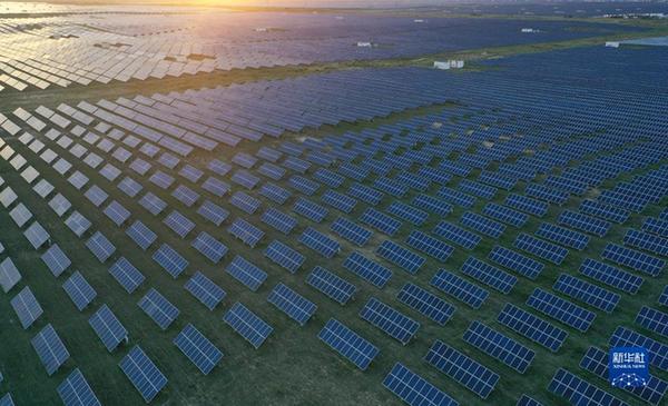 這是青海省海南藏族自治州共和縣境內的大唐青海公司新能源分公司光伏電站一角(2020年7月7日攝,無人機照片)。新華社記者 張宏祥 攝