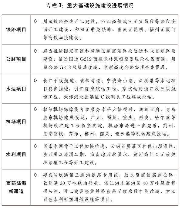四是適度超前開展重大基礎設施建設。精準有效推進交通、水利、物流、能源、新型基礎設施、民生等領域重大基礎設施項目建設。推進川藏鐵路、西部陸海新通道、沿江高鐵、一批鐵路專用線重點項目和川藏公路G318線提質改造等加快建設。整體推進京津冀、長三角、粵港澳大灣區城市群城際鐵路、市域(郊)鐵路建設。鼓勵推廣軌道交通+土地綜合開發模式經驗。做好中長期鐵路網、國家公路網和全國港口與航道布局規劃修編,強化國家公路、港口和高等級航道網絡功能。推動三峽水運新通道研究論證。實施國家水網重大工程。加快發展公鐵水多式聯運。提升樞紐機場綜合保障能力和服務水平,加快培育支線航空市場,提高國際航空貨運能力。加快“支點城市+骨干走廊”現代流通網絡建設。穩步推進國家物流樞紐、國家骨干冷鏈物流基地建設,強化冷鏈運輸環節疫情防控措施,完善“321”冷鏈物流運行體系。加快物流業制造業融合創新發展,積極推動多式聯運、智慧物流等新業態新模式發展。布局一批新型基礎設施項目,加快推進5G、千兆光網、一體化大數據中心、北斗產業化重大工程、民用空間基礎設施等建設,推動傳統基礎設施智能化改造。