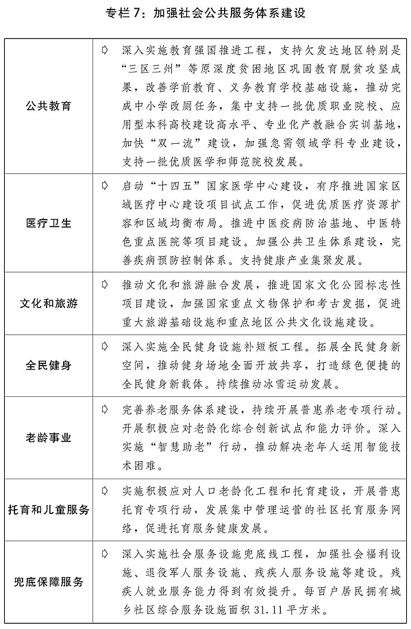 四是完善公共服務政策制度體系。分類推進基本公共服務均等化發展,推動服務重心向基層下沉,增加普惠性非基本公共服務供給。支持社會力量增加普惠性托育服務供給,進一步完善學前教育收費政策,推進普惠性學前教育資源擴容增效,推進兒童友好城市建設。推動義務教育優質均衡發展和城鄉一體化,提升農村學校辦學能力,依據常住人口規模增加城鎮教育資源。繼續做好義務教育階段減負工作。加強縣域普通高中建設。改善職業教育辦學條件。推進高?!半p一流”建設,加快經濟社會發展重點領域急需學科專業建設、人才培養和科技攻關,完善產教融合政策措施。支持中西部高等教育發展,高校招生繼續加大對中西部和農村地區傾斜力度。加強教師隊伍建設,加大中西部地區教師培訓力度。辦好特殊教育、繼續教育,規范民辦教育發展。完善三孩生育政策配套措施,將3歲以下嬰幼兒照護費用納入個人所得稅專項附加扣除,推動生育支持政策落地見效。貫徹落實積極應對人口老齡化國家戰略,加強養老托育服務體系和健康支撐體系建設,維護好老年人合法權益。推動公立醫院高質量發展,加快健全現代醫院管理制度,深入推進國家醫學中心、國家區域醫療中心建設項目和縣級醫院建設,加快完善分級診療體系,深化醫療服務價格、醫保支付管理和公立醫院薪酬制度改革。補齊婦幼兒科、精神衛生、老年醫學等服務短板。持續深入開展愛國衛生運動、推進實施健康中國行動,倡導文明健康綠色環保生活方式。實施現代化疾控體系建設、國家重大傳染病防治基地建設等工程,提升公共衛生防控救治能力。加快中醫藥特色發展。推動中華優秀傳統文化創造性轉化和創新性發展,促進出版、電影、廣播電視、文物等事業高質量發展,推進公共文化數字化建設,提供更多公共文化產品。加強國家重大文化項目和國家文化公園建設,加強重要文化遺產和國家公園等重要自然遺產保護設施建設,全面提升革命文物保護利用水平,促進公共文化服務提質升級。推進國民旅游休閑加快發展,不斷完善節假日制度。實施全民健身設施補短板工程,加強體育公園等全民健身場地設施建設。深化公共法律服務體系建設。