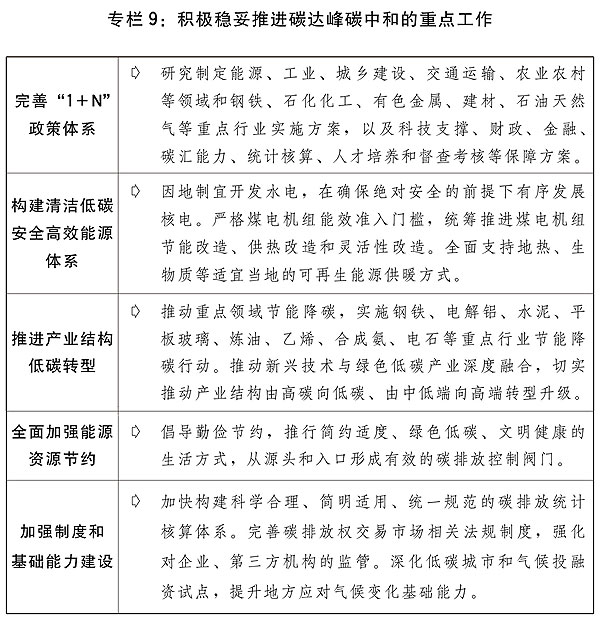 二是積極穩妥推進碳達峰碳中和。完善碳達峰碳中和“1+N”政策體系,實施“碳達峰十大行動”,堅持“全國一盤棋”。大力發展非化石能源,建設大型風電、光伏基地項目,積極發展分布式新能源,積極推動海上風電集群化開發,穩妥推進西南等地大型水電基地建設,大力發展抽水蓄能,在確保絕對安全的前提下積極有序發展核電,推進煤炭清潔高效利用。提升電網對可再生能源發電的消納能力。做好全國碳排放權交易市場第二個履約周期管理。實施節能降碳改造升級。積極研究開發碳捕捉利用與封存技術。優化完善能耗雙控政策,合理增加能耗總量彈性,新增可再生能源和原料用能不納入能源消費總量控制,推動能耗“雙控”向碳排放總量和強度“雙控”轉變。全面加強能源資源節約,強化工業、交通和建筑節能,不斷降低單位產出能耗物耗和碳排放。對標能效標桿水平,推動能效低于基準水平的重點行業企業,有序實施改造升級,促進高耗能行業高質量發展。繼續做好碳達峰碳中和及應對氣候變化國際談判與合作,主動參與全球綠色治理體系建設,加強綠色經貿、技術與金融合作。