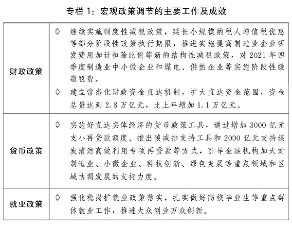 二是保持宏觀政策連續性針對性。宏觀政策適應跨周期調節需要,保持對經濟恢復必要支持力度,同時考慮為今年應對困難挑戰預留政策空間。積極的財政政策提質增效、更可持續。保持必要的財政支出規模,地方政府專項債券發行使用管理進一步優化,建立常態化財政資金直達機制,將2.8萬億元中央財政資金納入直達范圍,及時為基層?;久裆?、保工資、保運轉提供財力支持。全年新增減稅降費為市場主體減負超過1萬億元。對制造業中小微企業、煤電和供熱企業實施階段性緩繳稅費。貨幣政策靈活精準、合理適度,靈活運用降準、再貸款、再貼現等多種政策工具,兩次全面降準,流動性保持合理充裕,廣義貨幣供應量(M2)余額和社會融資規模存量分別增長9%和10.3%。加大對實體經濟、重點領域和薄弱環節的支持力度,企業綜合融資成本穩中有降,全年新增人民幣貸款19.95萬億元,比上年多增3150億元,大型商業銀行普惠小微企業貸款增幅超過40%,企業貸款平均利率為4.61%,比上年下降0.1個百分點。強化穩崗擴就業政策落實,扎實做好高校畢業生等重點群體就業工作,推進大眾創業萬眾創新。