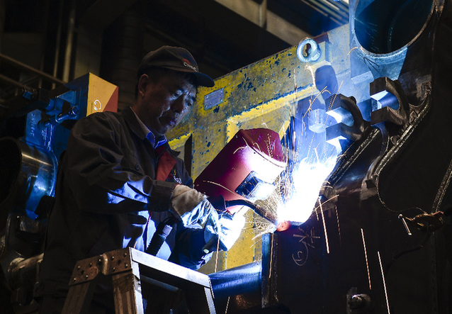 中車長客高級技師李萬君在車間內進行焊接作業。記者 許暢 攝