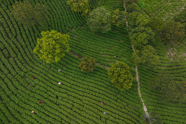 3月27日,茶農在浙江省湖州市長興縣和平鎮灘龍橋村的高山茶園采摘茶鮮葉(無人機照片)。